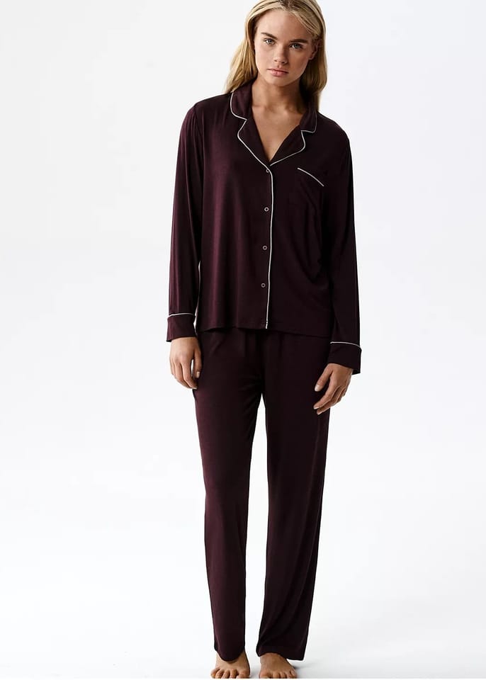 Piżama idealna na wiosnę i lato z ultralekkiego, oddychającego materiału, który zapewnia maksymalny komfort noszenia. Zapinana na guziki bluzka z długim rękawem i dekoltem w kształcie litery V oraz długie, proste spodnie. Skład: 95% modal, 5% elastan.