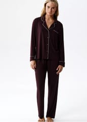 Piżama idealna na wiosnę i lato z ultralekkiego, oddychającego materiału, który zapewnia maksymalny komfort noszenia. Zapinana na guziki bluzka z długim rękawem i dekoltem w kształcie litery V oraz długie, proste spodnie. Skład: 95% modal, 5% elastan.