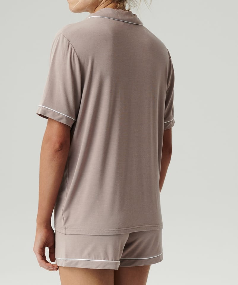 Piżama damska z lekkiego i delikatnie połyskującego modalu, niezwykle miękka, przewiewna oraz przyjemnie „chłodna” w dotyku i przyjazna dla ciała.Idealna na upalne dni! Bluzka z krótkimi rękawami, szorty z kieszeniami. Skład: 95% modal, 5% elastan.