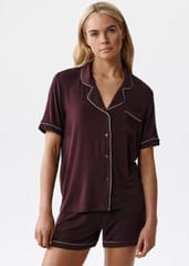 Piżama idealna na wiosnę i lato z ultralekkiego, oddychającego materiału, który zapewnia maksymalny komfort noszenia. Zapinana na guziki bluzka z krótkimi rękawami i dekoltem w kształcie litery V oraz krótkie spodenki. Skład: 95% modal, 5% elastan.