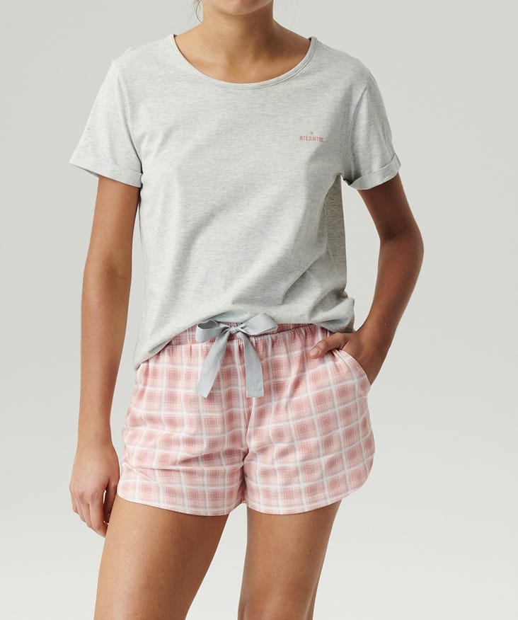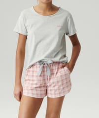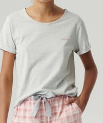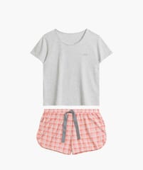 Piżama damska będąca połączeniem delikatnej bawełny oraz lekkiego i jedwabistego w dotyku modalu. Niezwykle miękka jest przyjazna dla skóry, przewiewna i przyjemnie „chłodna”. Luźna koszulka z logo i krótkie spodenki. Skład:50% modal, 50% bawełna.