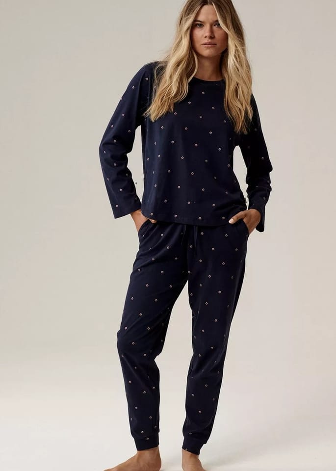 Piżama damska składa się z luźnej góry typu longsleeve i długich spodni. Bluza ma okrągłe wycięcie przy szyi oraz długie rękawy. Spodnie delikatnie zwężające się ku dołow i praktyczne kieszenie po bokach, wiązanie w pasie. Skład:100% bawełna.