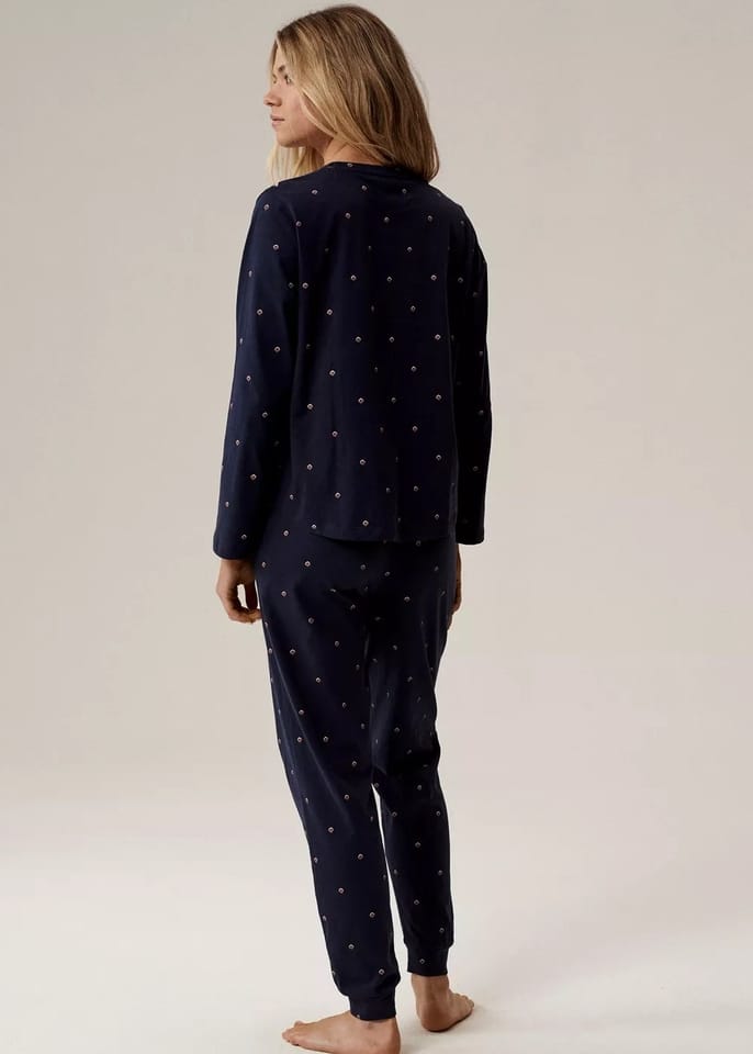 Piżama damska składa się z luźnej góry typu longsleeve i długich spodni. Bluza ma okrągłe wycięcie przy szyi oraz długie rękawy. Spodnie delikatnie zwężające się ku dołow i praktyczne kieszenie po bokach, wiązanie w pasie. Skład:100% bawełna.