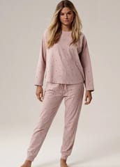 Piżama damska składa się z luźnej góry typu longsleeve i długich spodni. Bluza ma okrągłe wycięcie przy szyi oraz długie rękawy. Spodnie delikatnie zwężające się ku dołow i praktyczne kieszenie po bokach, wiązanie w pasie. Skład:100% bawełna.