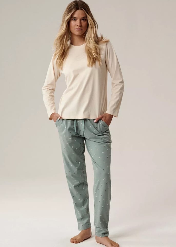 Piżama damska o uniwersalnym, prostym kroju z okrągłym dekoltem i długim rękawem. Spodnie w jasnym odcieniu zieleni, pokryte drobnym nadrukiem w kwiatki, mają zwężające się ku dołowi nogawki, boczne kieszenie i wiązanie w talii. Skład:100% bawełna.