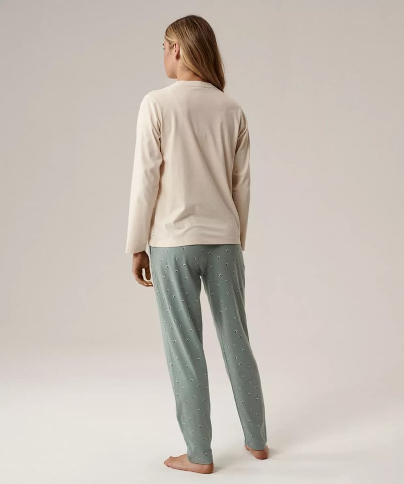 Piżama damska o uniwersalnym, prostym kroju z okrągłym dekoltem i długim rękawem. Spodnie w jasnym odcieniu zieleni, pokryte drobnym nadrukiem w kwiatki, mają zwężające się ku dołowi nogawki, boczne kieszenie i wiązanie w talii. Skład:100% bawełna.