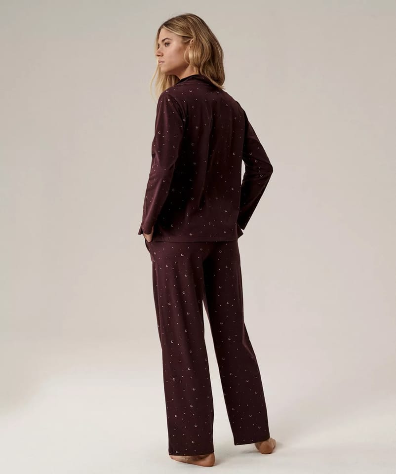 Dwuczęściowa piżama damska o luźnym kroju.Koszulowa bluzka ma kołnierz, wycięcie w kształcie litery V oraz zapięcie na guziki, natomiast spodnie mają szerokie, swobodnie puszczone nogawki i praktyczne kieszenie po bokach. Skład: 100% bawełna.