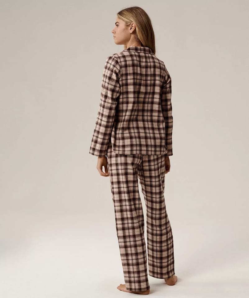Piżama o luźnym kroju we wzór w kratę z miękkiej, przyjaznej dla skóry bawełny.Bluzka o koszulowym kroju rozpinana, z kołnierzem. Spodnie mają kieszenie po bokach i nieuciskający ściągacz w pasie. Skład:100% bawełna.