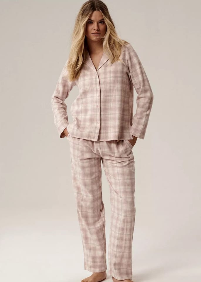 Piżama o luźnym kroju we wzór w kratę z miękkiej, przyjaznej dla skóry bawełny.Bluzka o koszulowym kroju rozpinana, z kołnierzem. Spodnie mają kieszenie po bokach i nieuciskający ściągacz w pasie. Skład:100% bawełna.
