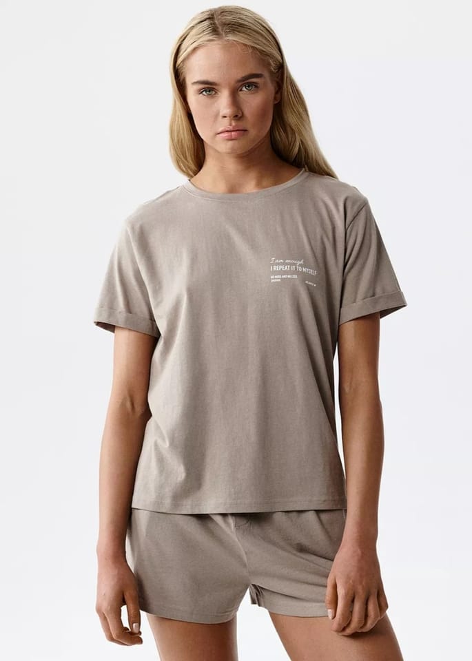 Luźna piżama damska została wykonana z miękkiej, przyjemnej w dotyku i przyjaznej dla skóry bawełnianej dzianiny, która przepuszcza powietrze, a przy tym jest odporna na uszkodzenia i działanie wysokich temperatur. Skład: 100% bawełna.