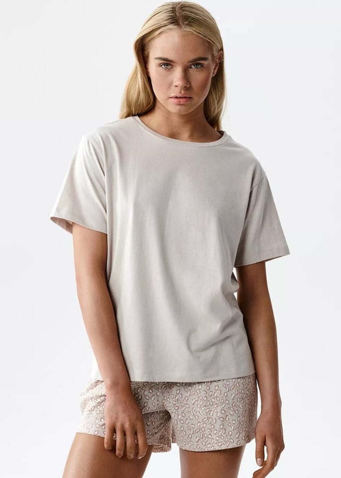 Luźna piżama damska została wykonana z miękkiej, przyjemnej w dotyku i przyjaznej dla skóry bawełnianej dzianiny, która przepuszcza powietrze, a przy tym jest odporna na uszkodzenia i działanie wysokich temperatur. Skład: 100% bawełna.