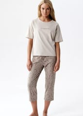 Piżama wykonana jest z miękkiej, przyjemnej w dotyku i przyjaznej dla skóry bawełnianej dzianiny. Luźny, gładki T-shirt z krótkim rękawem oraz spodnie 3/4 pokryte drobnymi, graficznymi wzorkami z komfortowym wiązaniem w pasie. Skład:100% bawełna.