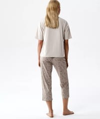 Piżama wykonana jest z miękkiej, przyjemnej w dotyku i przyjaznej dla skóry bawełnianej dzianiny. Luźny, gładki T-shirt z krótkim rękawem oraz spodnie 3/4 pokryte drobnymi, graficznymi wzorkami z komfortowym wiązaniem w pasie. Skład:100% bawełna.