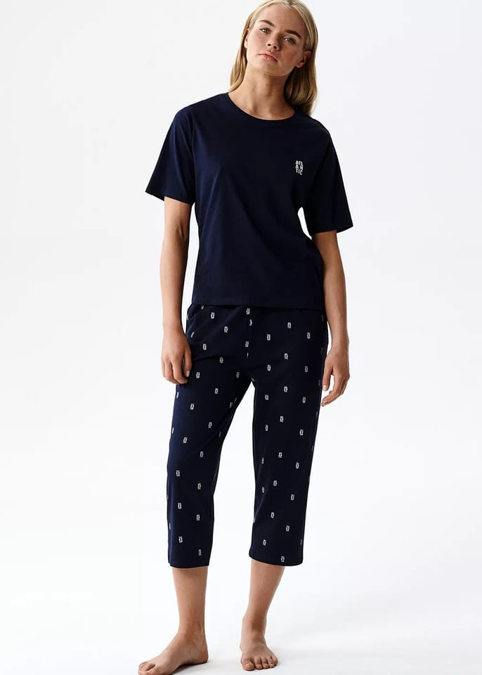 Piżama damska wykonanat z miękkiej i przyjemnej w dotyku bawełnianej dzianiny, która jest przyjazna dla skóry, przepuszcza powietrze i zapewnia komfort termiczny. Materiał jest odporny na codzienne użytkowanie. Skład:100% bawełna.