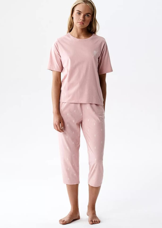 Piżama damska wykonanat z miękkiej i przyjemnej w dotyku bawełnianej dzianiny, która jest przyjazna dla skóry, przepuszcza powietrze i zapewnia komfort termiczny. Materiał jest odporny na codzienne użytkowanie. Skład:100% bawełna.