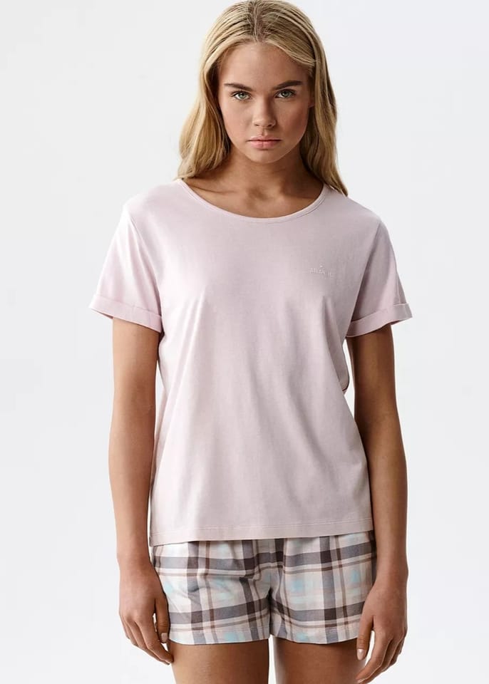 Przewiewna, niezwykle miękka i przyjemnie chłodna w dotyku piżama damska. T-shirt o prostym kroju z subtelnie podwiniętymi rękawkami. Krótkie spodenki w ponadczasową kratkę. Skład: 50% modal, 50% bawełna.