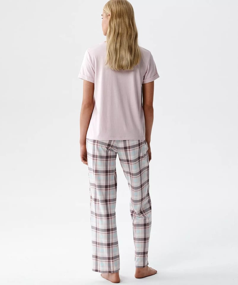 Przewiewna, niezwykle miękka i przyjemnie chłodna w dotyku piżama damska. T-shirt o prostym kroju z subtelnie podwiniętymi rękawkami. Spodnie mają długie, luźne i proste nogawki. Skład: 50% modal, 50% bawełna.