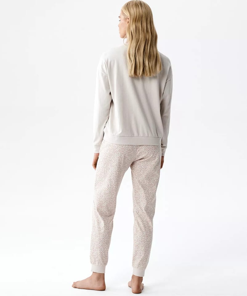 Piżama wykonana jest z miękkiej, przyjemnej w dotyku i przyjaznej dla skóry bawełnianej dzianiny. Gładka bluza typu longsleeve oraz spodnie długie we wzorki w cętki wiązane na sznurek w talii. Super propozycja na cały rok. Skład:100% bawełna.
