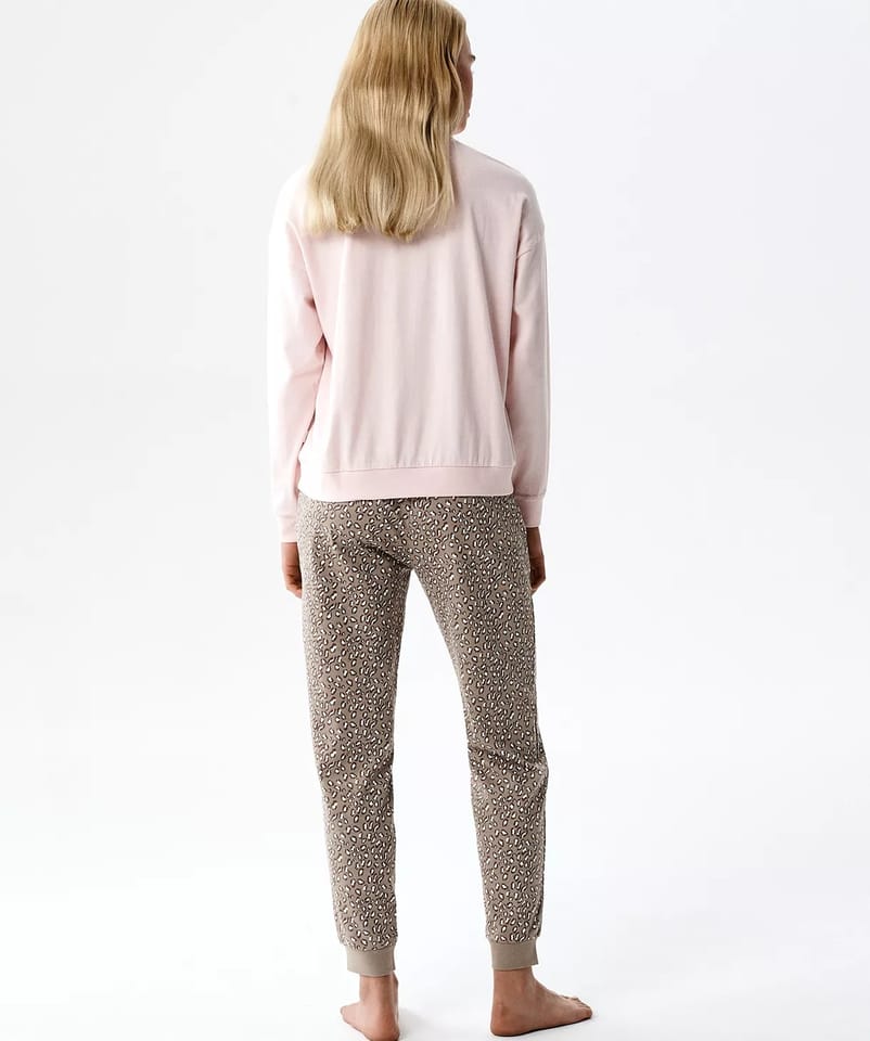 Piżama wykonana jest z miękkiej, przyjemnej w dotyku i przyjaznej dla skóry bawełnianej dzianiny. Gładka bluza typu longsleeve oraz spodnie długie we wzorki w cętki wiązane na sznurek w talii. Super propozycja na cały rok. Skład:100% bawełna.
