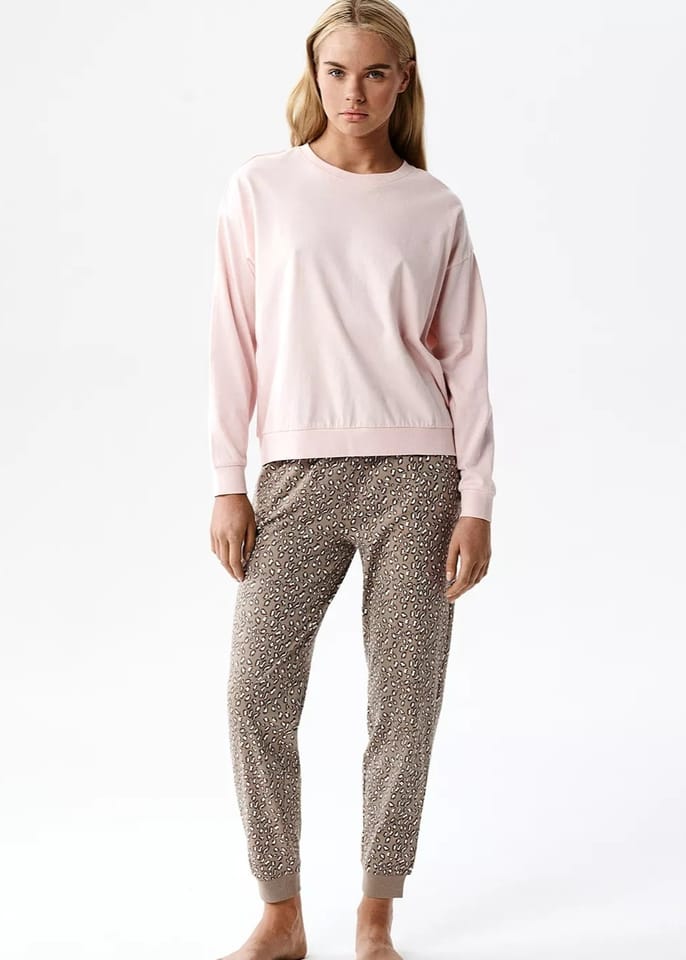 Piżama wykonana jest z miękkiej, przyjemnej w dotyku i przyjaznej dla skóry bawełnianej dzianiny. Gładka bluza typu longsleeve oraz spodnie długie we wzorki w cętki wiązane na sznurek w talii. Super propozycja na cały rok. Skład:100% bawełna.