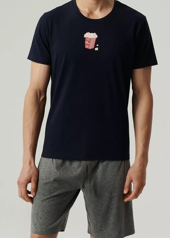 Bawełniana piżama o sportowym charakterze, która może być również zestawieniem na dzień. Koszulka gładka, luźna z okrągłym dekoltem i zabawnym nadrukiem z przodu. Spodeneki z wygodnymi kieszeniami.