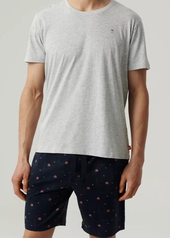 Bawełniana piżama o sportowym charakterze, która może być również zestawieniem na dzień. Koszulka gładka, luźna z okrągłym dekoltem. Spodenek ozdobione motywem koszykarskim. Skład:góra: 95% bawełna, 5% elastan, dół: 100% bawełna.