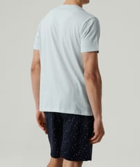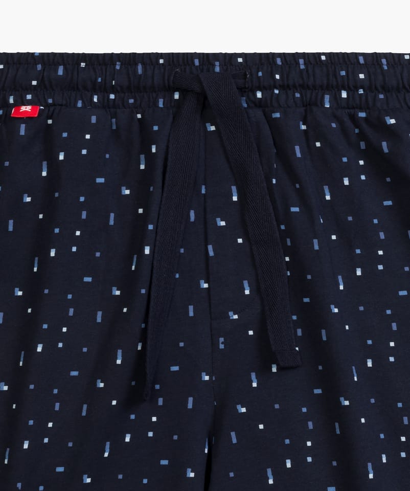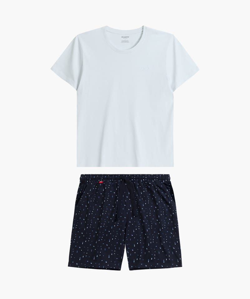Piżama męska w skład której wchodzi gładki t-shirt oraz spodenki z geometrycznym nadrukiem, wiązane na sznurek z wygodnymi i praktycznymi kieszeniami. Dzianina bawełniana o właściwościach higroskopijnych. Skład: 100% bawełna.