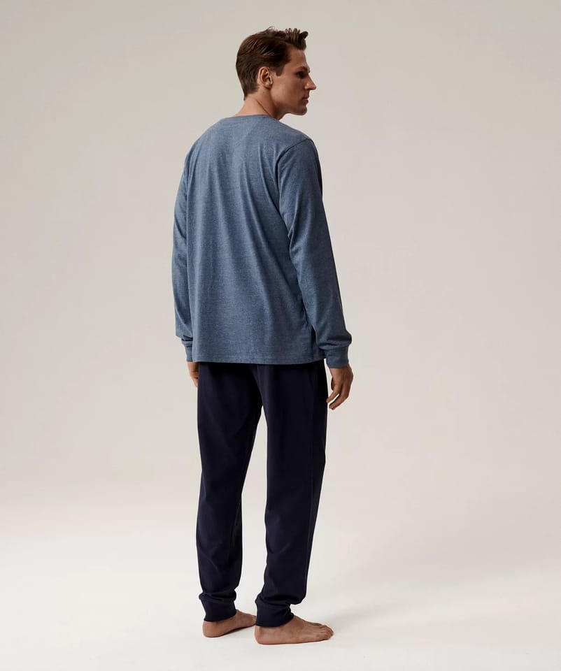 Luźna, komfortowa piżama wykonana z przyjemnej w dotyku bawełny z efektem brzoskwini (peach effect). Bluza ma okrągły dekolt i długie rękawy wykończone szerokimi ściągaczami. Dół ma proste nogawki i kieszenie po bokach. Skład:100% bawełna.