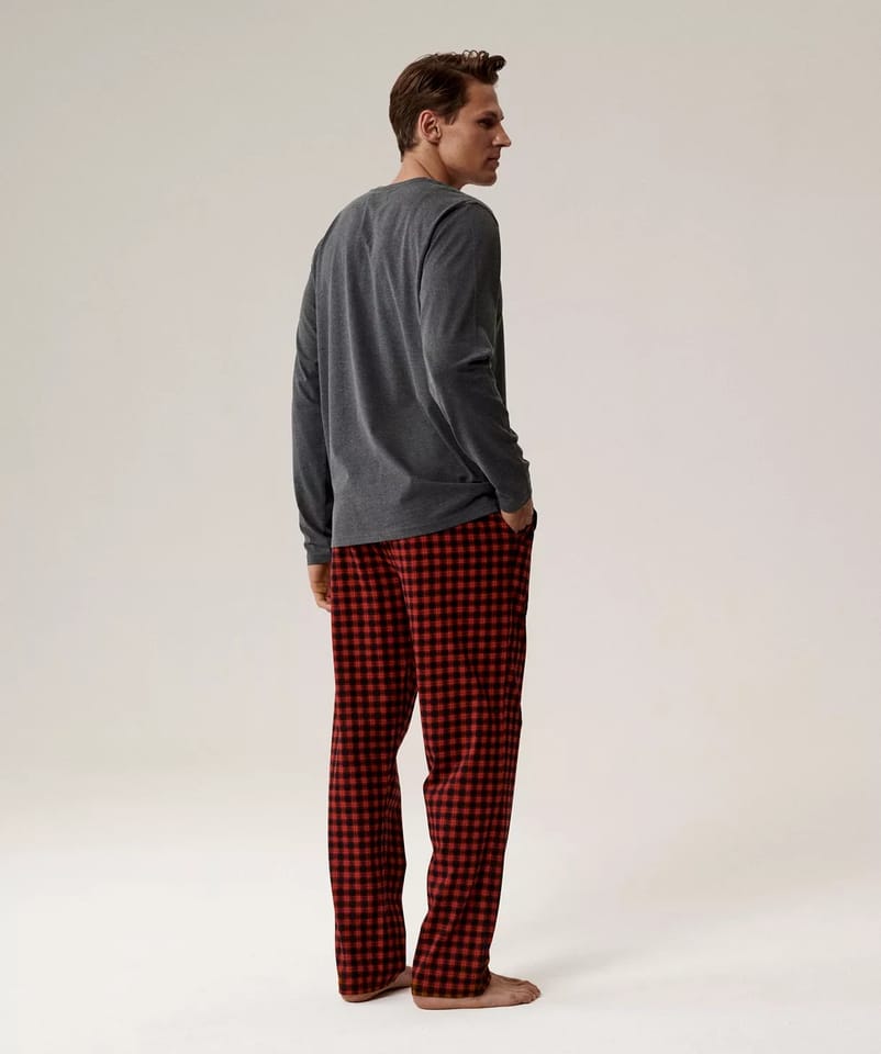Klasyczna i wygodna ciepła piżama męska. Bluza luźna z okrągłym wycięciem przy szyi, zapinanym na guziki. Spodnie z luźną nogawką, proste, w kratę, z kieszeniami po bokach. Skład: góra: 60% bawełna, 40% poliester, dół: 100% bawełna.