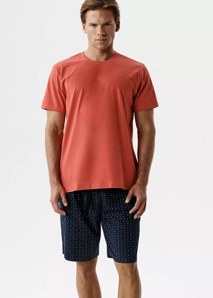 Piżama została wykonana z wysokiej jakości bawełny uszlachetnionej peach effect — miękkiej, lekkiej i przyjaznej dla skóry. T-shirt z krótkim rękawem oraz szorty z regulacją na sznurek i praktycznymi kieszeniami. Skład:100% bawełna.