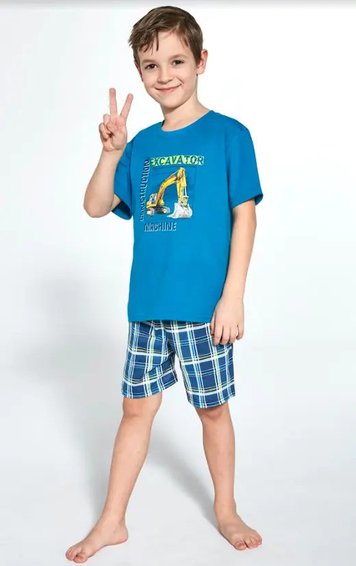 Piżama chłopięca wykonana z wysokiej jakości miękkiej bawełny. Koszulka z krótkim rękawem, przód ozdobiony kolorowym nadrukiem. Spodenki krótkie w kratę. Pakowana w pudełko. Skład: 100% bawełna.