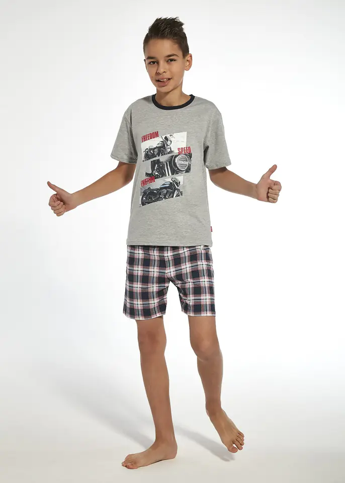Wygodna piżama chłopięca z wysokiej jakości miękkiej bawełny. Koszulka z krótkim rękawem, ozdobiona kolorowym nadrukiem. Krótkie spodenki w kratkę. W pasie wygodna gumka obszyta bawełną. Skład: koszulka 92% bawełna, 8% poliester; spodenki 100% bawełna.