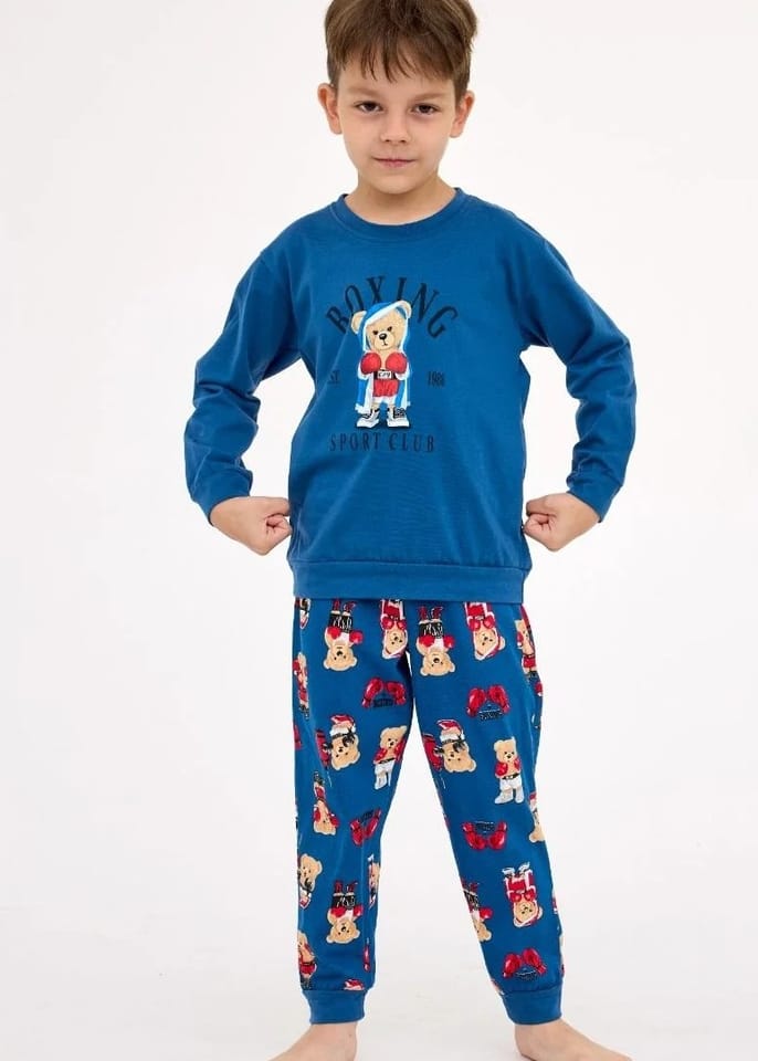 Wygodna piżama chłopięca z wysokiej jakości wyjątkowo miłej i miękkiej bawełny. Dół koszulki, mankiety i nogawki zakończone ściągaczem. Ciekawy wzór. Skład: 100% bawełana.