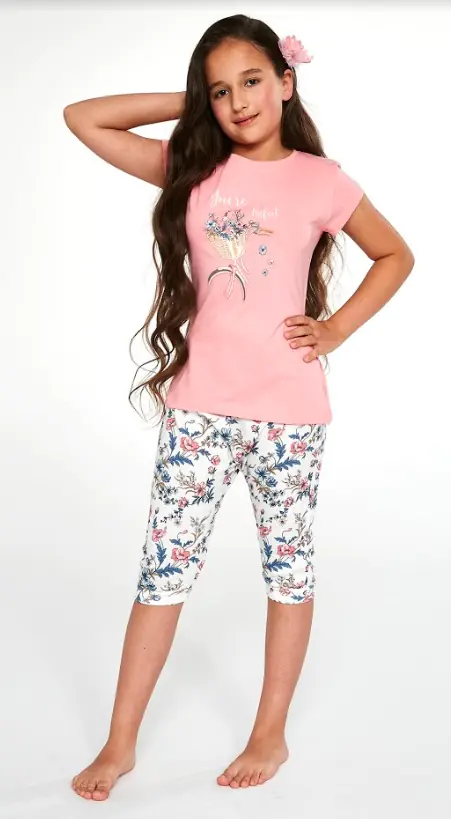 Piżama dziewczęca wykonana z wysokiej jakości wyjątkowo miękkiej bawełny. Koszulka z krótkim rękawem ozdobiona wzorem. Spodenki w kwiaty typu rybaczki. Pakowana w pudełko. Skład: 100% bawełna.
