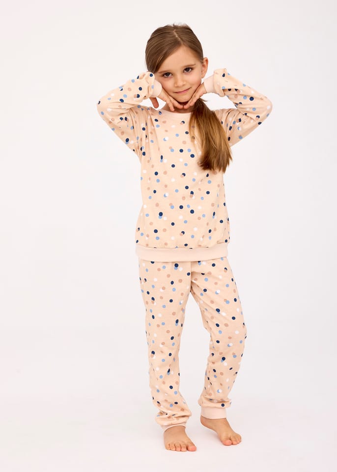 Piżama dziewczęca z wysokiej jakości, miękkiej bawełny w kolorowe groszki. Bluzka z długim rękawem, dekolt okrągły, mankiety i dół zakończone ściągaczem. Spodnie długie z kieszeniami, nogawki zakończone ściągaczem. Skład: 100% bawełna.