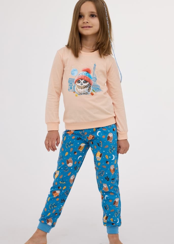 Piżama dziewczęca z wysokiej jakości miękkiej bawełny. Koszulka z długim rękawem z przodu ozdobiona kolorowym nadrukiem. Do kompletu długie wzorzyste spodnie. Rękawki, nogawki i dół bluzy obszyte ściągaczem. Skład: 100% bawełna.