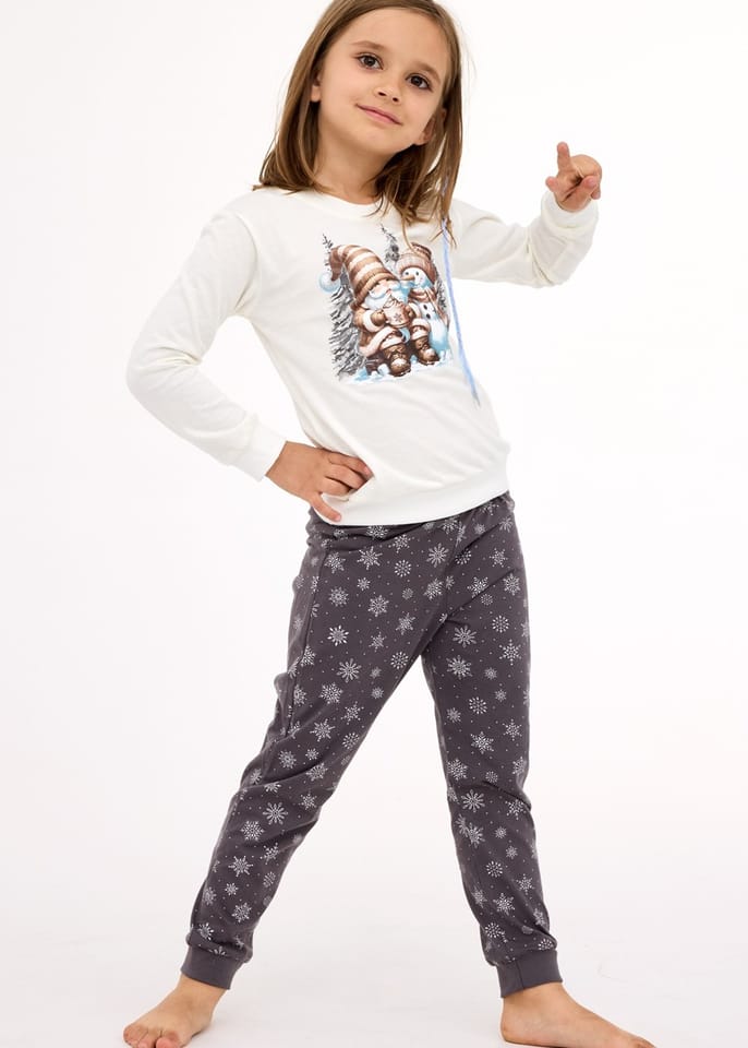 Piżama dziewczęca z miękkiej, naturalnej bawełny. Koszulka z długim rękawem ozdobiona świątecznym nadrukiem. Do kompletu długie spodnie z zimowym motywem. Dekolt, mankiety, dół koszulki i nogawki wykończone ściągaczem. Skład:100% bawełna.
