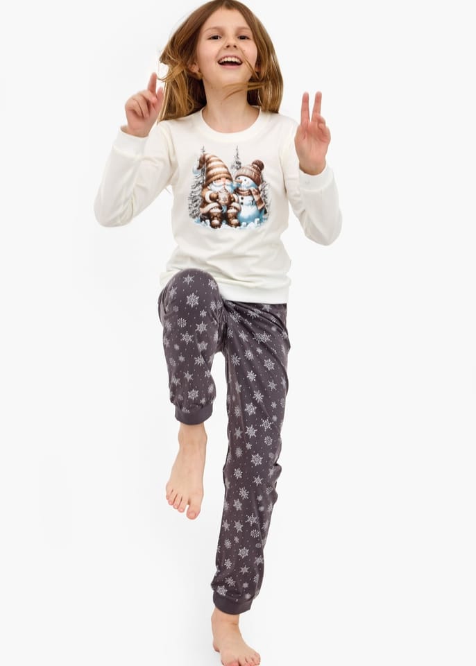 Piżama dziewczęca z miękkiej, naturalnej bawełny. Koszulka z długim rękawem ozdobiona świątecznym nadrukiem. Do kompletu długie spodnie z zimowym motywem. Dekolt, mankiety, dół koszulki i nogawki wykończone ściągaczem. Skład:100% bawełna.
