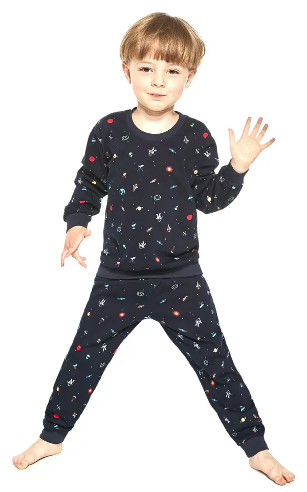 Piżama chłopięca wykonana z wysokiej jakości bawełny. Bluzka z długim rękawem, spodnie z długie. Piżama wzorzysta, zakończona wygodnym ściągaczem. Skład: 100% bawełna.