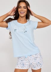 Dwuczęściowa piżama damska wykonana z wysokiej jakości bawełny. Koszulka jednolita z krótkim rękawem i małym nadrukiem na piersi. Spodenki krótkie z satynową kokardką w pasie. Skład: 100% bawełna.