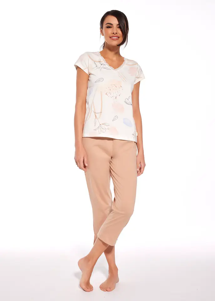 Piżama damska z krótkim rękawem o wzorzystym wzorze, jednolite spodnie o długości 7/8. Wykonana jest z wysokiej jakości, 100% bawełny. Skład: 100% bawełna.