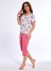 Piżama damska wykonana z wysokiej jakości bawełny. Koszulka wzorzysta, krótki rękaw. Spodnie jednolite, typu rybaczki. Skład: 100% bawełna.