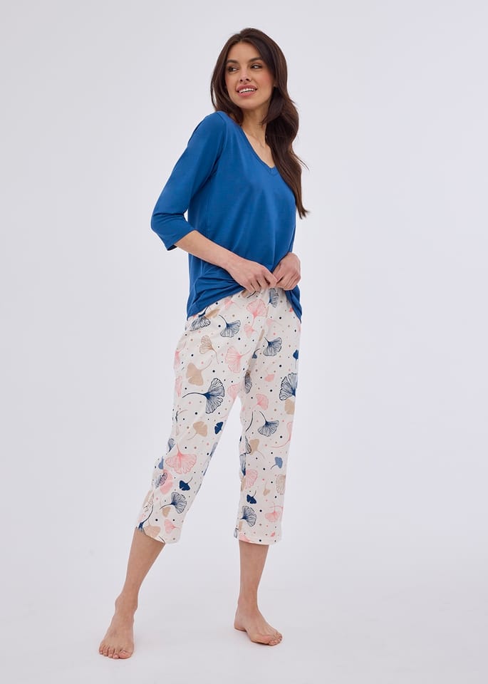 Wygodna, idealnie układająca się ciele piżama damska. Bluzka jednolita z rękawem 3/4 i dekoltem w serek. Spodnie wzorzyste długości 3/4. Skład: bluzka 95% modal, 5% elastan, spodnie: 100% bawełna.