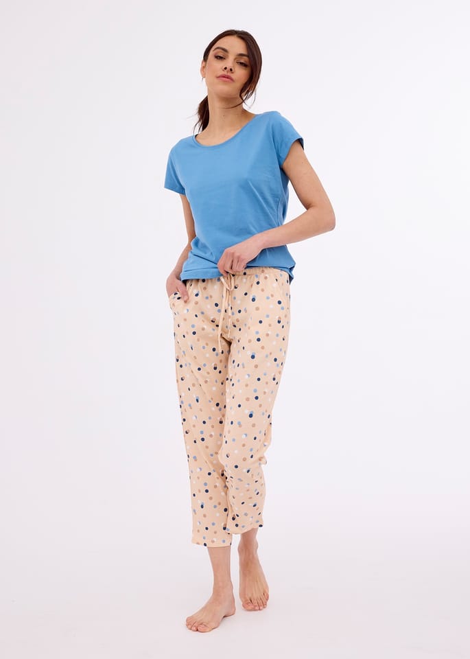 Piżama damska z wysokiej jakości bawełny. Koszulka jednolita z krótkim rękawem i okrągłym dekoltem. Spodnie wzorzyste 7/8, na biodrach wygodne kieszenie, w pasie wiązany sznureczek. Skład: 100% bawełna.