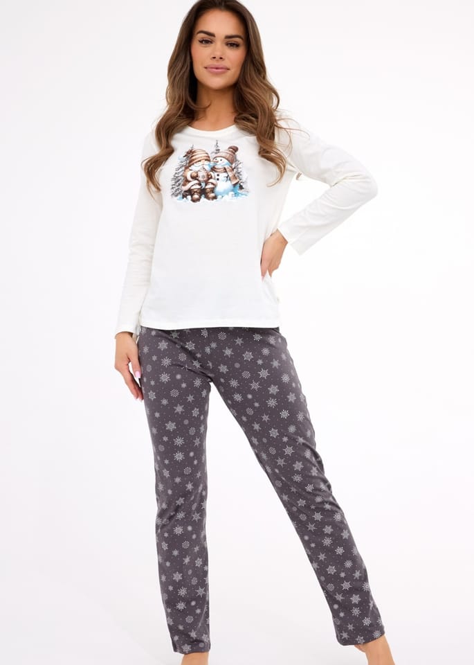 Piżama świąteczna uszyta z wysokiej jakości bawełny. Koszulka z długim rękawem, przód ozdobiony kolorowym nadrukiem. Do kompletu długie wzorzyste spodnie. Dekolt, mankiety oraz dół koszulki z nogawki zakończone wygodnym ściągaczem.Skład: 100% bawełna.