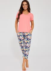 Piżama damska wykonana z wysokiej jakości bawełny jest miękka, oddychająca i delikatna dla skóry. Koszulka gładka, z krótkim rękawem. Do kompletu wzorzyste spodnie długości 7/8 z wygodnymi kieszeniami po bokach. Skład:100% bawełna