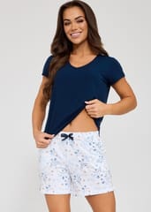 Dwuczęściowa piżama damska wykonana z wysokiej jakości bawełny. Koszulka jednolita z krótkim rękawem, spodenki krótkie z satynową kokardką w pasie. Skład: 100% bawełna.