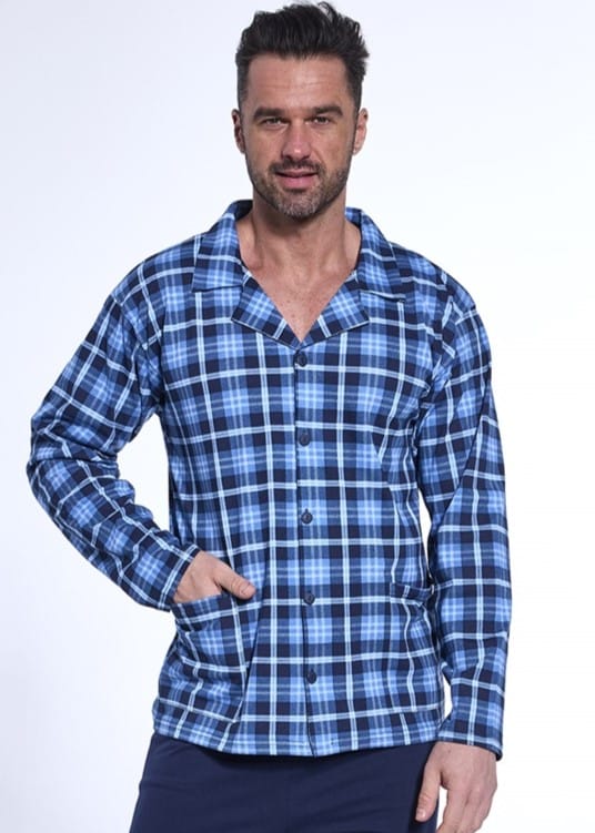 Rozpinana piżama męska z wysokiej jakości bawełny. Bluzka w kratkę, z długim rękawem, kołnierzykiem i kieszeniami, zapinana na guziki. Spodnie długie, proste, jednolite. Skład: 100% bawełna.