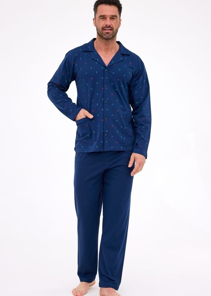 Piżama męska, rozpinana, uszyta z wysokiej jakość bawełny. Bluzka wzorzysta, z długim rękawem, kieszeniami i kołnierzykiem, zapinana na guziki. Spodnie długie, jednolite. Skład: 100% bawełna.