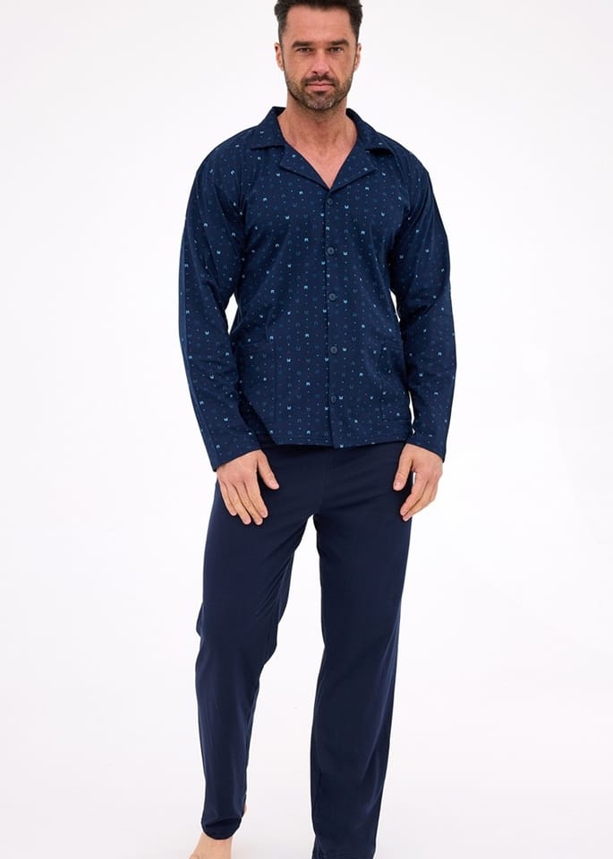 Piżama męska, rozpinana, uszyta z wysokiej jakość bawełny. Bluzka wzorzysta, z długim rękawem, kołnierzykiem, zapinana na guziki. Spodnie długie, jednolite. Skład: 100% bawełna.